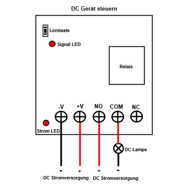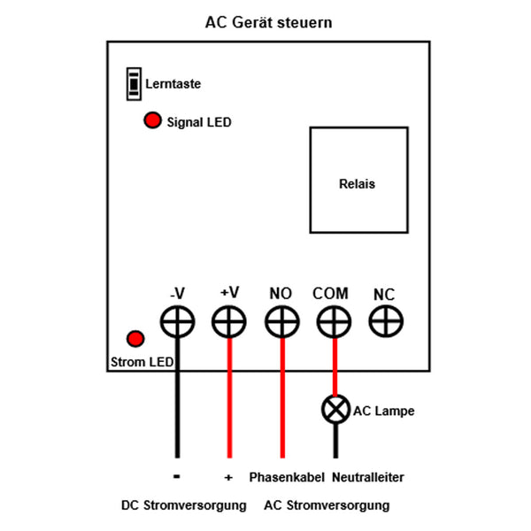 Relaisausgang: Dieser Empfänger ist der trockene Relaisausgang, es können zur Steuerung DC und AC Geräte verwendet werden. Die Ausgangsklemmen sind NO / NC (normalerweise geöffnet / normalerweise geschlossen) und dienen als Schalter. Es bedeutet, dass Sie auch eine separate Stromversorgung an Geräte anschließen sollen.