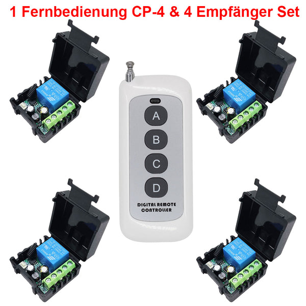 Sie können einen Sender verwenden, um mehrere Empfänger zu steuern, und jede Sendertaste steuert einen Empfänger. Zum Beispiel können Sie Verwenden den 2-Tasten-Sender, um 2 Empfänger zu kontrollieren, oder verwenden den 4-Tasten-Sender, um 4 Empfänger zu kontrollieren, oder verwenden den 12-Tasten-Sender, um 12 Empfänger zu kontrollieren.