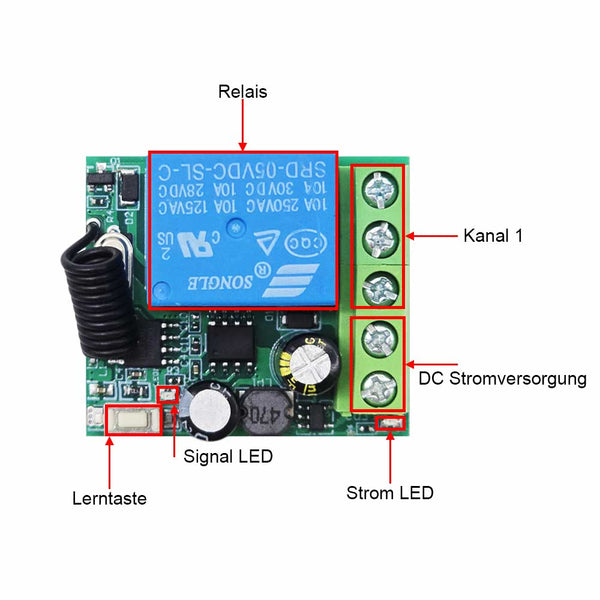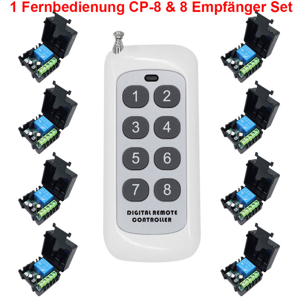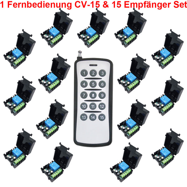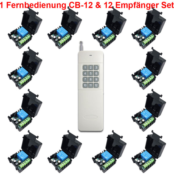 Dieser Empfänger das in einem Ein-Sender-Mehrere-Empfänger System verwendet werden kann. Zum Beispiel können Sie Verwenden den 1-Tasten-Sender, um 1 Empfänger zu kontrollieren, oder verwenden den 2-Tasten-Sender, um 2 Empfänger zu kontrollieren, oder verwenden den 4-Tasten-Sender, um 4 Empfänger zu kontrollieren, oder verwenden den 6-Tasten-Sender, um 6 Empfänger zu kontrollieren, oder verwenden den 8-Tasten-Sender, um 8 Empfänger zu kontrolliere, oder verwenden den 12-Tasten-Sender, um 12 Empfänger zu kontrolliere, oder verwenden den 15-Tasten-Sender, um 15 Empfänger zu kontrolliere.