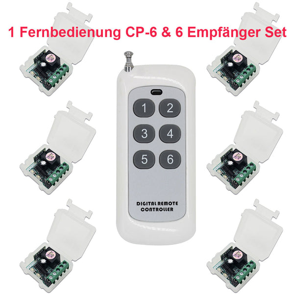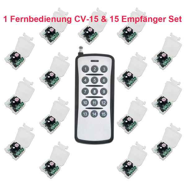 Dieser Empfänger das in einem Ein-Sender-Mehrere-Empfänger System verwendet werden kann. Zum Beispiel können Sie Verwenden den 1-Tasten-Sender, um 1 Empfänger zu kontrollieren, oder verwenden den 2-Tasten-Sender, um 2 Empfänger zu kontrollieren, oder verwenden den 4-Tasten-Sender, um 4 Empfänger zu kontrollieren, oder verwenden den 6-Tasten-Sender, um 6 Empfänger zu kontrollieren, oder verwenden den 8-Tasten-Sender, um 8 Empfänger zu kontrolliere, oder verwenden den 12-Tasten-Sender, um 12 Empfänger zu kontrolliere, oder verwenden den 15-Tasten-Sender, um 15 Empfänger zu kontrolliere.