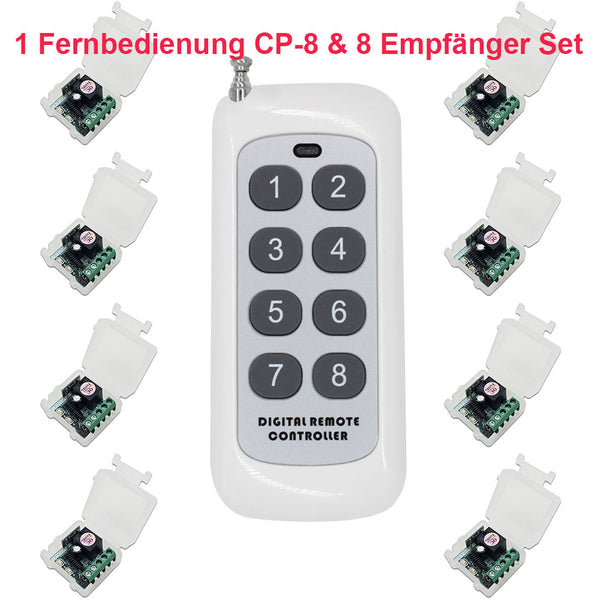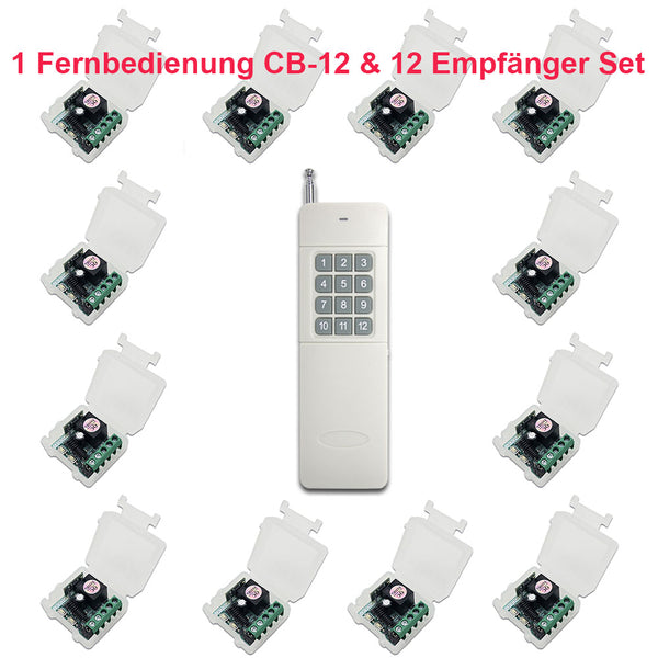 Sie können einen Sender verwenden, um mehrere Empfänger zu steuern, und jede Sendertaste steuert einen Empfänger. Zum Beispiel können Sie Verwenden den 2-Tasten-Sender, um 2 Empfänger zu kontrollieren, oder verwenden den 4-Tasten-Sender, um 4 Empfänger zu kontrollieren, oder verwenden den 12-Tasten-Sender, um 12 Empfänger zu kontrollieren.