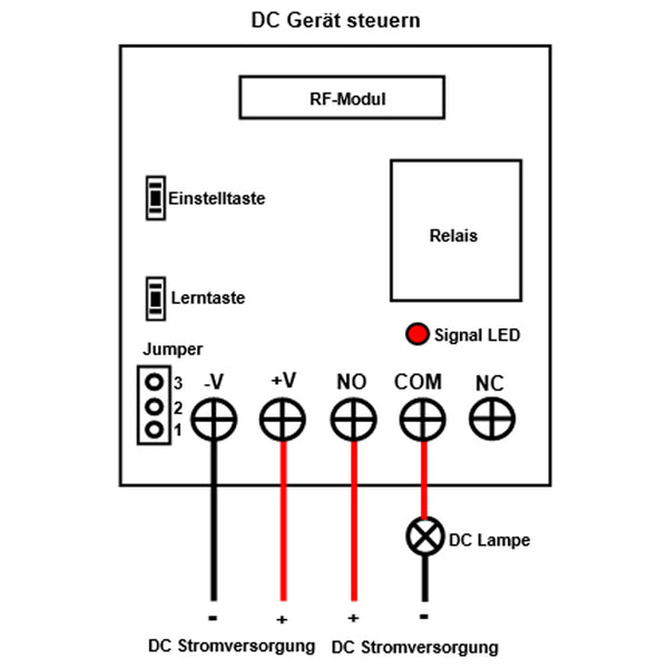 Relaisausgang: Dieser Empfänger ist der trockene Relaisausgang, es können zur Steuerung DC und AC Geräte verwendet werden. Die Ausgangsklemmen sind NO / NC (normalerweise geöffnet / normalerweise geschlossen) und dienen als Schalter. Es bedeutet, dass Sie auch eine separate Stromversorgung an Geräte anschließen sollen.