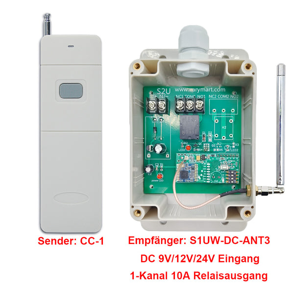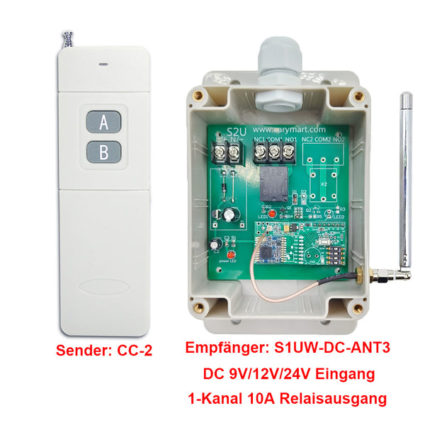 Dieser Empfänger S1UW-DC-ANT3 und der Sender CC-1 / CC-2 bilden ein Empfänger Sender System. Dieses System kann in allen Arten von Industrie automation, Landwirtschaft, Haus, Fabrik, Haus, Bauernhof, Fahrzeug, Schiff, Offshore-Betrieb, Luftfahrzeug usw. Es kann verschiedene DC oder AC Geräte an Land, zu Wasser und in der Luft fernsteuern, wie Lichter, Sirenen, Schlösser, Motoren, Ventilatoren, Türen, Fenster, Elektromagnetventile, Sicherheitsalarm und Geschäftsschilder.