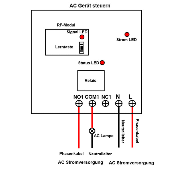 Relaisausgang: Dieser Empfänger ist der trockene Relaisausgang, es können zur Steuerung DC und AC Geräte verwendet werden. Die Ausgangsklemmen sind NO / NC (normalerweise geöffnet / normalerweise geschlossen) und dienen als Schalter. Es bedeutet, dass Sie auch eine separate Stromversorgung an Geräte anschließen sollen.