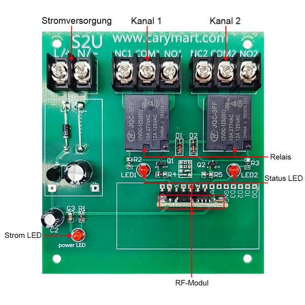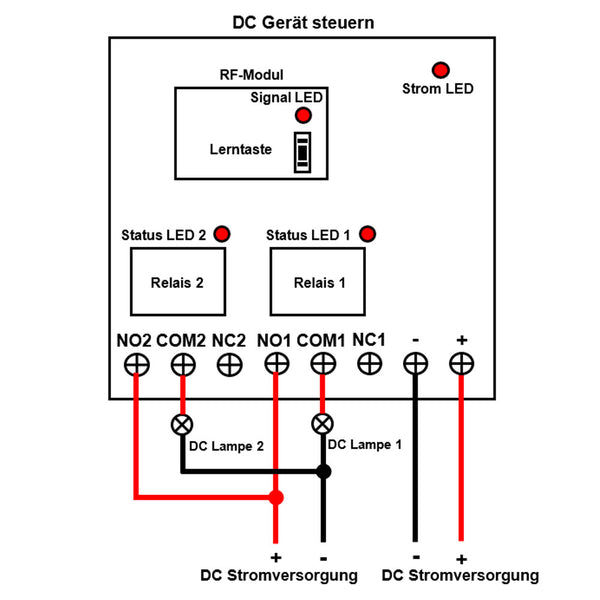 Relaisausgang: Dieser Empfänger ist der trockene Relaisausgang, es können zur Steuerung DC und AC Geräte verwendet werden. Die Ausgangsklemmen sind NO / NC (normalerweise geöffnet / normalerweise geschlossen) und dienen als Schalter. Es bedeutet, dass Sie auch eine separate Stromversorgung an Geräte anschließen sollen.