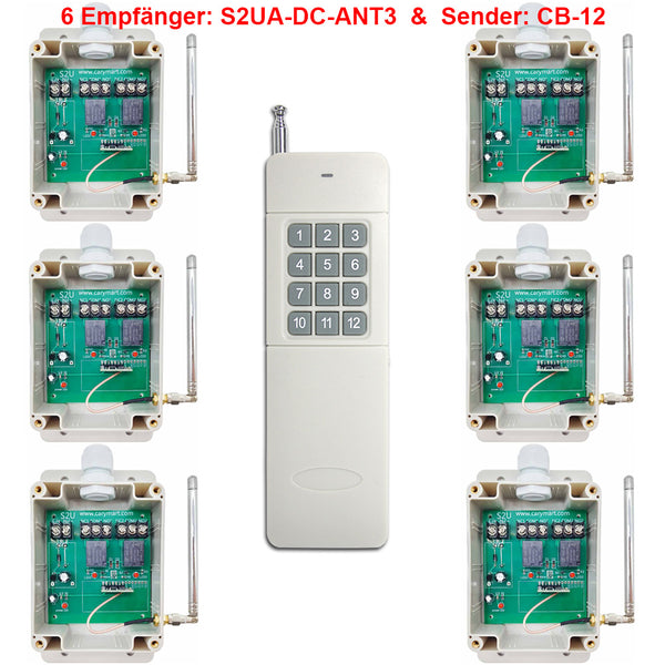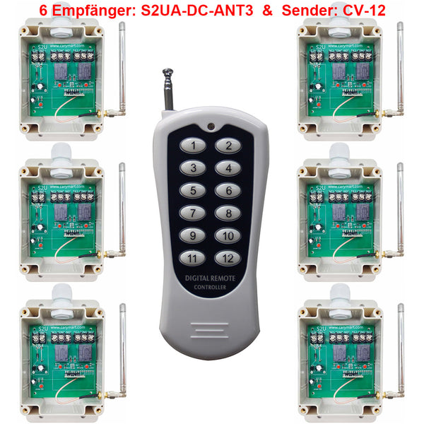 Sechs Empfänger S2UA-DC-ANT3 und der Sender CV-12 bilden ein Ein-Sender-Mehrere-Empfänger System. Dieses System kann in allen Arten von Industrie automation, Landwirtschaft, Haus, Fabrik, Haus, Bauernhof, Fahrzeug, Schiff, Offshore-Betrieb, Luftfahrzeug usw. Es kann AC oder DC Geräte an Land, zu Wasser und in der Luft fernsteuern, wie Lichter, Sirenen, Schlösser, Motoren, Ventilatoren, Winden, Jalousien, Linearantriebe, Türen, Fenster, Elektromagnetventile, Sicherheitsalarm und Geschäftsschilder.