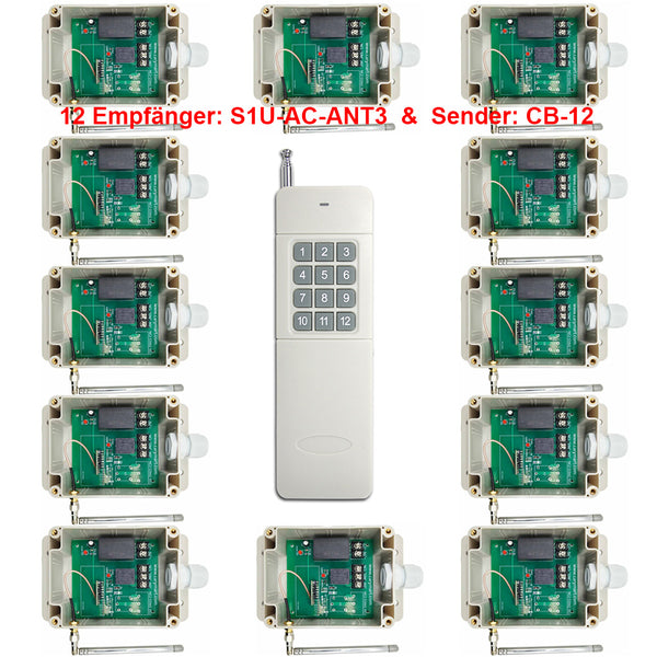 Zwölf Empfänger S1U-AC-ANT3 und der Sender CV-12 / CB-12 bilden ein Ein-Sender-Mehrere-Empfänger System. Dieses System kann in allen Arten von Industrie automation, Landwirtschaft, Haus, Fabrik, Haus, Bauernhof, Fahrzeug, Schiff, Offshore-Betrieb, Luftfahrzeug usw. Es kann AC oder DC Geräte an Land, zu Wasser und in der Luft fernsteuern, wie Lichter, Sirenen, Schlösser, Motoren, Ventilatoren, Türen, Fenster, Elektromagnetventile, Sicherheitsalarm und Geschäftsschilder.