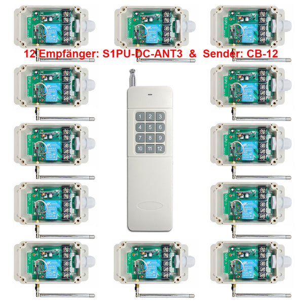 Zwölf Empfänger S1PU-DC-ANT3 und der Sender CV-12 / CB-12 bilden ein Ein-Sender-Mehrere-Empfänger System. Dieses System kann in allen Arten von Industrie automation, Landwirtschaft, Haus, Fabrik, Haus, Bauernhof, Fahrzeug, Schiff, Offshore-Betrieb, Luftfahrzeug usw. Es kann AC oder DC Geräte an Land, zu Wasser und in der Luft fernsteuern, wie Lichter, Sirenen, Schlösser, Motoren, Ventilatoren, Türen, Fenster, Elektromagnetventile, Sicherheitsalarm und Geschäftsschilder.