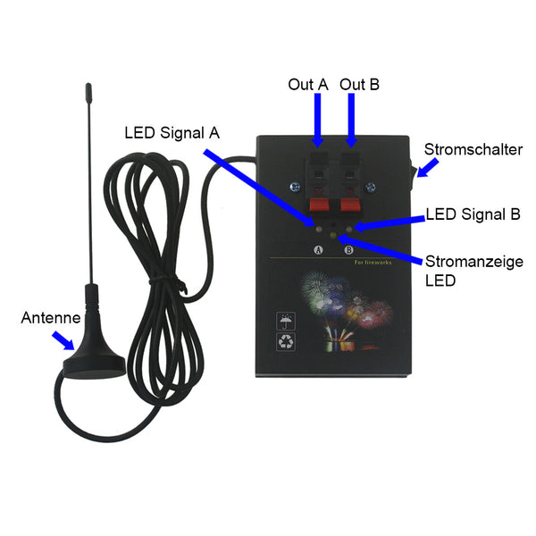Schalten den Empfänger ein. Drücken Taste A, Feuerwerk 1 wird angezündet; Drücken Taste B, Feuerwerk 2 wird angezündet.