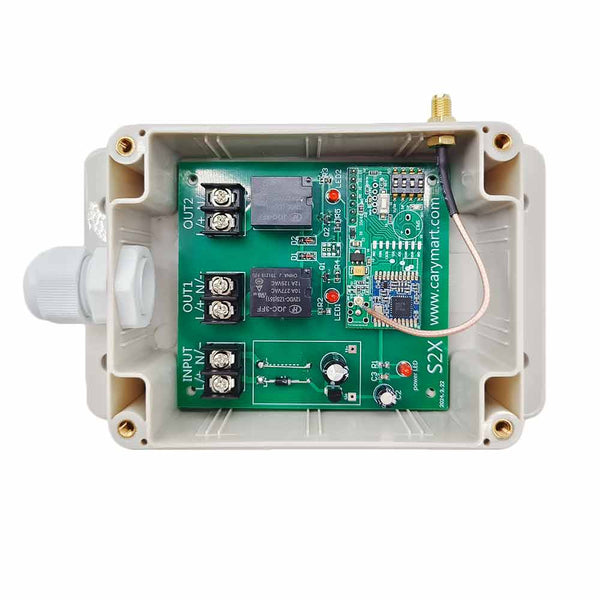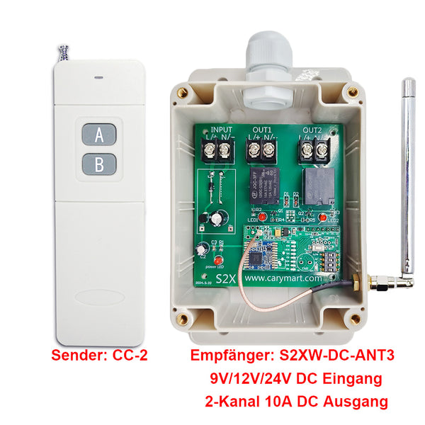 Dieser Empfänger S2XW-DC-ANT3 und der Sender CC-2 / CCW-2 bilden ein Empfänger Sender System. Dieses System kann in allen Arten von Industrie automation, Landwirtschaft, Haus, Fabrik, Haus, Bauernhof, Fahrzeug, Schiff, Offshore-Betrieb, Luftfahrzeug usw. Es kann verschiedene DC Geräte an Land, zu Wasser und in der Luft fernsteuern, wie Lichter, Sirenen, Schlösser, Motoren, Ventilatoren, Winden, Jalousien, Linearantriebe, Türen, Fenster, Elektromagnetventile, Sicherheitsalarm und Geschäftsschilder.