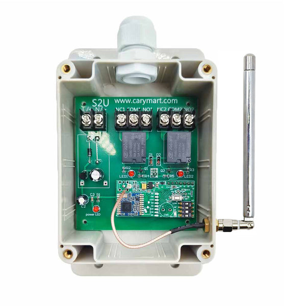 Dieser Empfänger ist ein elektrisches Gerät mit 2 trockenem Relaisausgang, es und der Sender bilden ein Empfänger Sender System. Dieses System kann in allen Arten von Industrie automation, Landwirtschaft, Haus, Fabrik, Haus, Bauernhof, Fahrzeug, Schiff, Offshore-Betrieb, Luftfahrzeug usw. Es kann verschiedene DC oder AC Geräte an Land, zu Wasser und in der Luft fernsteuern, wie Lichter, Sirenen, Schlösser, Motoren, Ventilatoren, Winden, Jalousien, Linearantriebe, Türen, Fenster, Elektromagnetventile, Sicherheitsalarm und Geschäftsschilder. Die Anwendungen sind endlos.