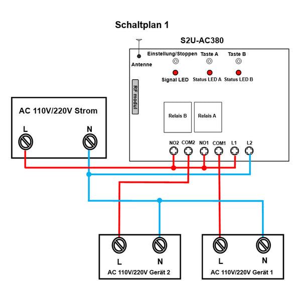 Drücken und halten die Taste 1 des Senders oder die Taste A des Empfängers: Das Relais 1 ist aktiviert, und der Schütz 1 ist angeschlossen, das Gerät 1 funktioniert.