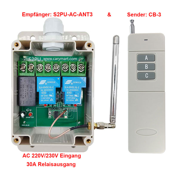 Dieser Empfänger S2PU-AC-ANT3 und der Sender CB-2 / CB-3 bilden ein Funk-Fernbedienungssystem. Dieses System kann in allen Arten von Industrie automation, Landwirtschaft, Haus, Fabrik, Haus, Bauernhof, Fahrzeug, Schiff, Offshore-Betrieb, Luftfahrzeug usw. Es kann AC oder DC Geräte an Land, zu Wasser und in der Luft fernsteuern, wie Lichter, Sirenen, Schlösser, Motoren, Ventilatoren, Winden, Jalousien, Linearantriebe, Türen, Fenster, Elektromagnetventile, Sicherheitsalarm und Geschäftsschilder.