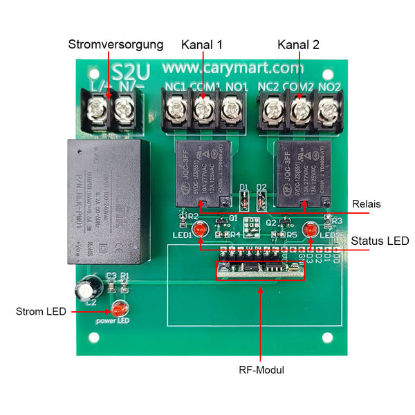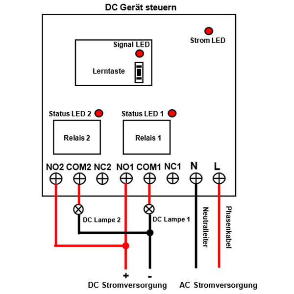 Relaisausgang: Dieser Empfänger ist der trockene Relaisausgang, es können zur Steuerung DC und AC Geräte verwendet werden. Die Ausgangsklemmen sind NO / NC (normalerweise geöffnet / normalerweise geschlossen) und dienen als Schalter. Es bedeutet, dass Sie auch eine separate Stromversorgung an Geräte anschließen sollen.