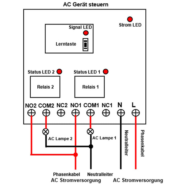 Relaisausgang: Dieser Empfänger ist der trockene Relaisausgang, es können zur Steuerung DC und AC Geräte verwendet werden. Die Ausgangsklemmen sind NO / NC (normalerweise geöffnet / normalerweise geschlossen) und dienen als Schalter. Es bedeutet, dass Sie auch eine separate Stromversorgung an Geräte anschließen sollen.