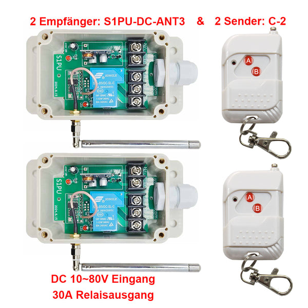 Hochleistungs Funkfernschalter Set - 2 Sender 2 Empfänger 30A Relaisausgang (Modell 0020300)