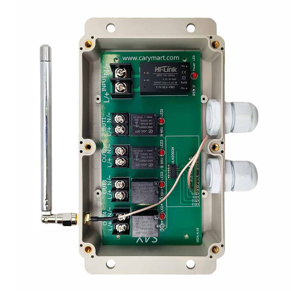 Dieser Empfänger ist ein elektrisches Gerät mit 4 Kanal AC Stromversorgung Ausgang, es und der Sender bilden ein Empfänger Sender System. Dieses System kann in allen Arten von Industrie automation, Landwirtschaft, Haus, Fabrik, Haus, Bauernhof, Fahrzeug, Schiff, Offshore-Betrieb, Luftfahrzeug usw. Es kann verschiedene AC Geräte an Land, zu Wasser und in der Luft fernsteuern, wie Lichter, Sirenen, Schlösser, Motoren, Ventilatoren, Winden, Jalousien, Linearantriebe, Türen, Fenster, Elektromagnetventile, Sicherheitsalarm und Geschäftsschilder. Die Anwendungen sind endlos.
