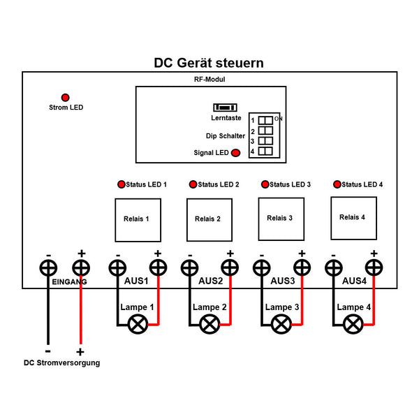 Drücken Sie die Taste D am Sender: Klemme <AUS4> gibt DC Strom aus, das Licht 4 ist an. Andere 3 Klemmen stoppen die Ausgabe, andere 3 Lampe sind aus.