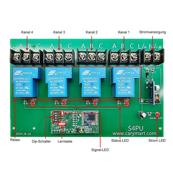Relaisausgang: Dieser Empfänger ist der trockene Relaisausgang, es können zur Steuerung DC und AC Geräte verwendet werden. Die Ausgangsklemmen sind NO / NC (normalerweise geöffnet / normalerweise geschlossen) und dienen als Schalter.
