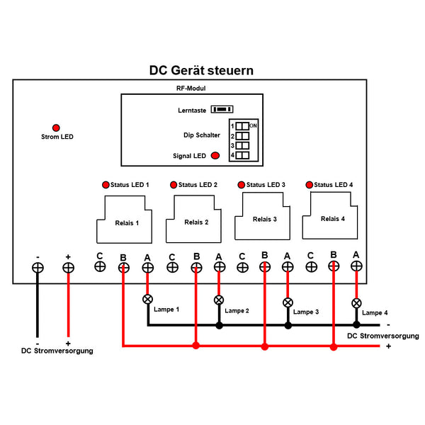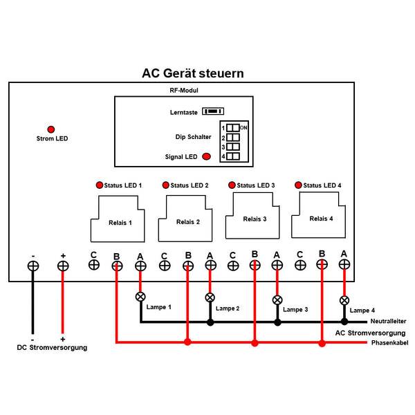 Drücken Sie die Taste A am Sender: Das Relais 1 im Empfänger wird aktiviert und die angeschlossene Lampe 1 wird eingeschaltet; Die anderen 3 Relais wird deaktiviert und die anderen 3 angeschlossene Lampen wird ausgeschaltet.