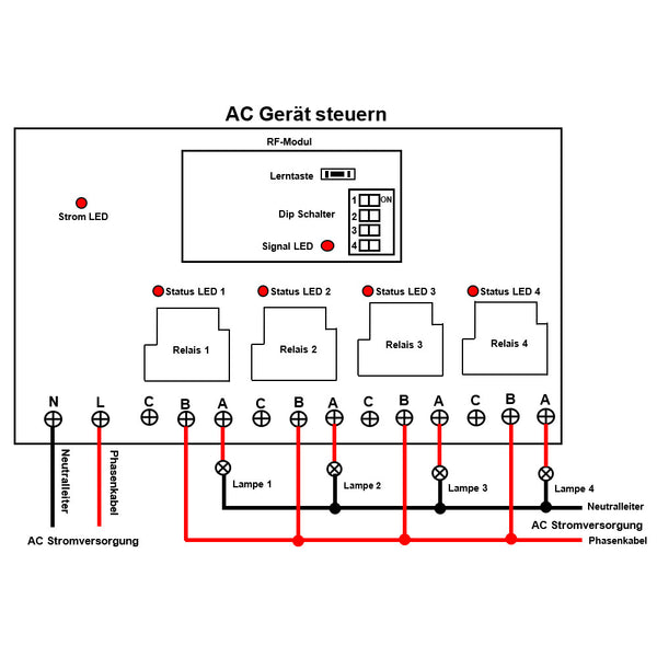 Drücken Sie die Taste A am Sender: Das Relais 1 im Empfänger wird aktiviert und die angeschlossene Lampe 1 wird eingeschaltet; Die anderen 3 Relais wird deaktiviert und die anderen 3 angeschlossene Lampen wird ausgeschaltet.