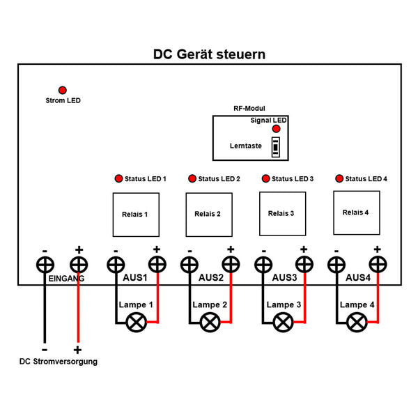 Drücken Sie die Taste D am Sender: Die Klemme <AUS4> der Empfänger ausgang DC Stromversorgung, und die angeschlossene Lampe 4 wird eingeschaltet.