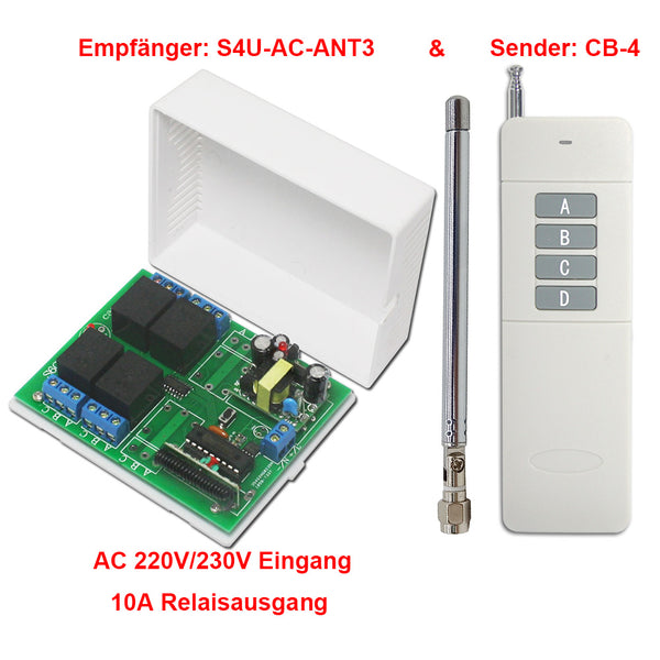 Der Empfänger S4U-AC-ANT3 und der Sender CB-4 bilden ein Funk-Fernbedienungssystem. Es kann in der Industrie-Automatisierung, Landwirtschaft-Automation und Heim-Automation, wie Fabrik, haus, bauernhof, weide, Fahrzeugen, Schiffen, Offshore-Betrieb, Luftfahrzeug, Feld Anruf, usw. Es kann drahtlose fernbedienung verschiedene ausrüstungen an Land, Wasser und Luft, wie Funklichtschalter, Sirenen, Schlösser, Motoren, Ventilatoren, Winden, Jalousien, Elektrozylinder, Türen, Fenster, Elektromagnetventile, Signalisierung, Geschäftsschilder usw.