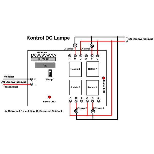 Drücken und halten die Taste A: Das Relais 1 ist aktiviert (verbinden Sie die Klemmen B und C, trennen Sie die Klemmen A und B), und die Lampe 1 wird eingeschaltet.