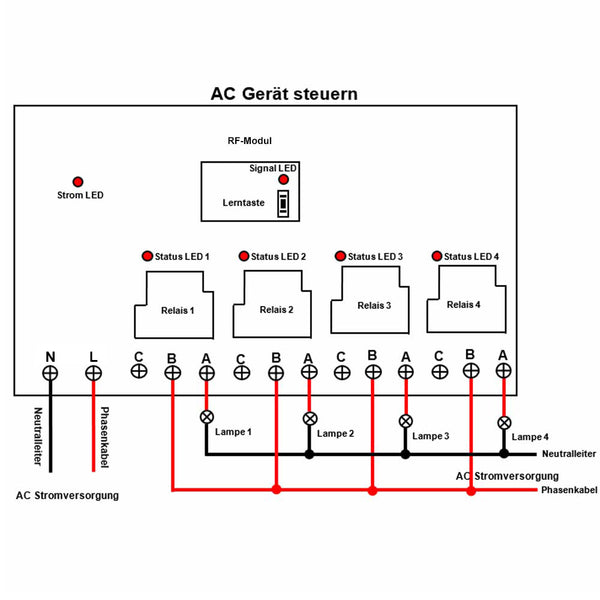 Relaisausgang: Dieser Empfänger ist der trockene Relaisausgang, es können zur Steuerung DC und AC Geräte verwendet werden. Die Ausgangsklemmen sind NO / NC (normalerweise geöffnet / normalerweise geschlossen) und dienen als Schalter.