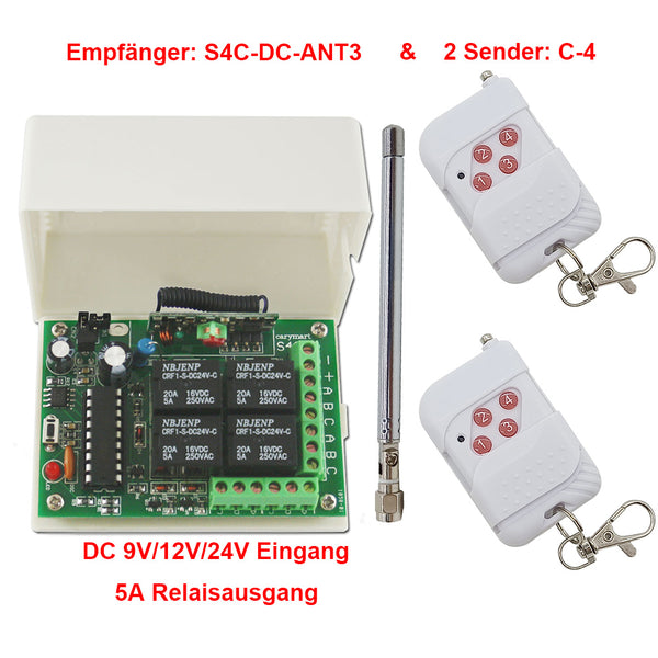 Der Empfänger S4C-DC-ANT3 und zwei Sender C-4 bilden ein Funk-Fernbedienungssystem. Es kann in der Industrie-Automatisierung, Landwirtschaft-Automation und Heim-Automation, wie Fabrik, haus, bauernhof, weide, Fahrzeugen, Schiffen, Offshore-Betrieb, Luftfahrzeug, Feld Anruf, usw. Es kann drahtlose fernbedienung verschiedene ausrüstungen an Land, Wasser und Luft, wie Funklichtschalter, Sirenen, Schlösser, Motoren, Ventilatoren, Winden, Jalousien, Elektrozylinder, Türen, Fenster, Elektromagnetventile, Signalisierung, Geschäftsschilder usw.