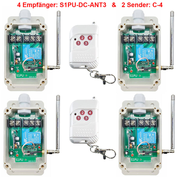 Vier Empfänger S1PU-DC-ANT3 und zwei Sender C-4 bilden ein Ein-Sender-Mehrere-Empfänger System. Dieses System kann in allen Arten von Industrie automation, Landwirtschaft, Haus, Fabrik, Haus, Bauernhof, Fahrzeug, Schiff, Offshore-Betrieb, Luftfahrzeug usw. Es kann AC oder DC Geräte an Land, zu Wasser und in der Luft fernsteuern, wie Lichter, Sirenen, Schlösser, Motoren, Ventilatoren, Türen, Fenster, Elektromagnetventile, Sicherheitsalarm und Geschäftsschilder.