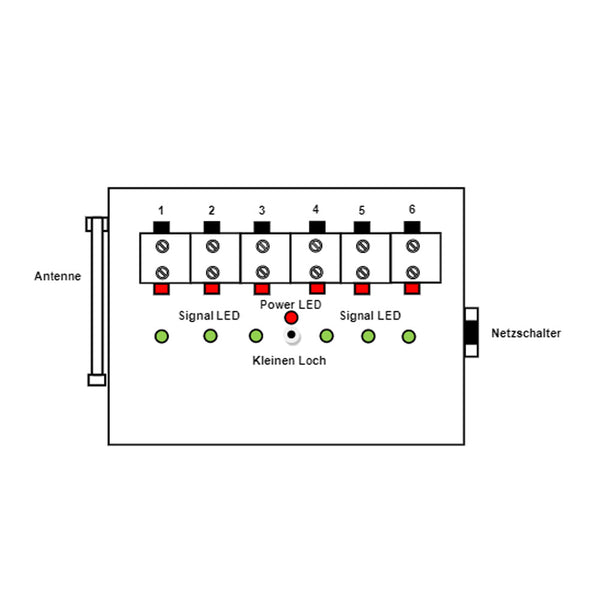 Schalten Sie den Netzschalter am Controller aus und schließen Sie zwei Drähte jedes elektronischen Feuerwerks an die roten und schwarzen Klemmen jedes Kanals an, oder schließen Sie eine gewöhnliche Feuerwerkssicherung an den elektrischen Zündkopf an und schließen Sie den elektrischen Zündkopf an die roten und schwarzen Klemmen an. Schalten Sie dann den Netzschalter am Controller ein. Wenn sechs Signal LEDs leuchten, bedeutet dies, dass alle Feuerwerksanschlüsse korrekt sind.