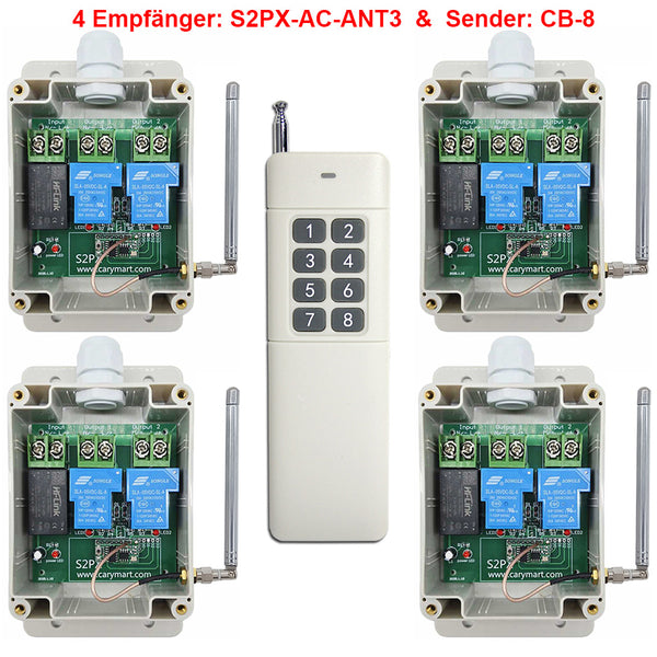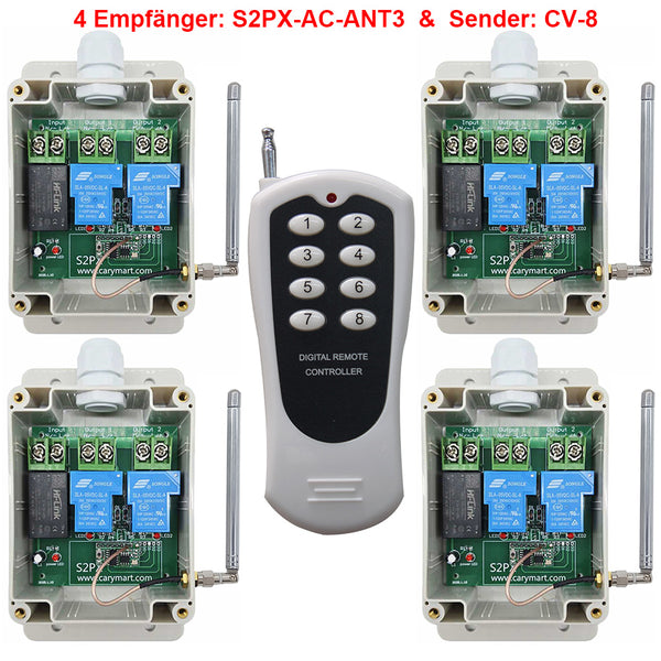 Vier Empfänger S2PX-AC-ANT3 und der Sender CV-8 bilden ein Funk-Fernbedienungssystem. Dieses System kann in allen Arten von Industrie automation, Landwirtschaft, Haus, Fabrik, Haus, Bauernhof, Fahrzeug, Schiff, Offshore-Betrieb, Luftfahrzeug usw. Es kann verschiedene AC Geräte an Land, zu Wasser und in der Luft fernsteuern, wie Lichter, Sirenen, Schlösser, Motoren, Ventilatoren, Winden, Jalousien, Linearantriebe, Türen, Fenster, Elektromagnetventile, Sicherheitsalarm und Geschäftsschilder.