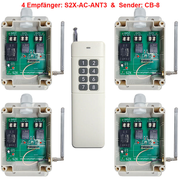 Vier Empfänger S2X-AC-ANT3 und der Sender CV-8 bilden ein Ein-Sender-Mehrere-Empfänger System. Dieses System kann in allen Arten von Industrie automation, Landwirtschaft, Haus, Fabrik, Haus, Bauernhof, Fahrzeug, Schiff, Offshore-Betrieb, Luftfahrzeug usw. Es kann AC Geräte an Land, zu Wasser und in der Luft fernsteuern, wie Lichter, Sirenen, Schlösser, Motoren, Ventilatoren, Winden, Jalousien, Linearantriebe, Türen, Fenster, Elektromagnetventile, Sicherheitsalarm und Geschäftsschilder.