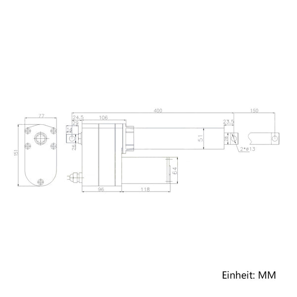 Einzugslänge: Wenn der Linearantrieb vollständig eingefahren ist, beträgt der Mittenabstand zwischen den beiden Montagelöchern 400 mm.