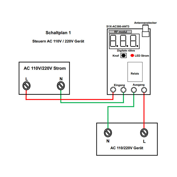1) Wenn Sie das AC 110V oder das 220V Gerät steuern möchten, können Sie den Empfänger, das Gerät und die Wechselstromversorgung gemäß dem folgenden Schaltplan 1 anschließen. Dann steuern Sie das Gerät mit dem Sender.