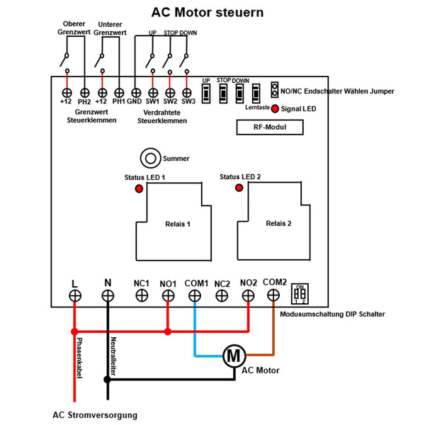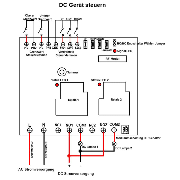 Wenn Sie die Taste DOWN drücken, werden zwei Klemmen <DOWN> und <GND> angeschlossen. Dann wird Relais 2 aktiviert. Und wenn Sie die Taste STOP drücken, werden zwei Klemmen <STOP> und <GND> angeschlossen. Dann wird Relais 2 deaktiviert.