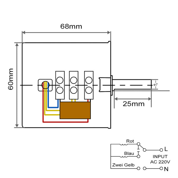 Zwei gelbe Drähte des Motors werden an Terminal “N” angeschlossen. Roter oder blau Draht wird an Terminals “L” angeschlossen.