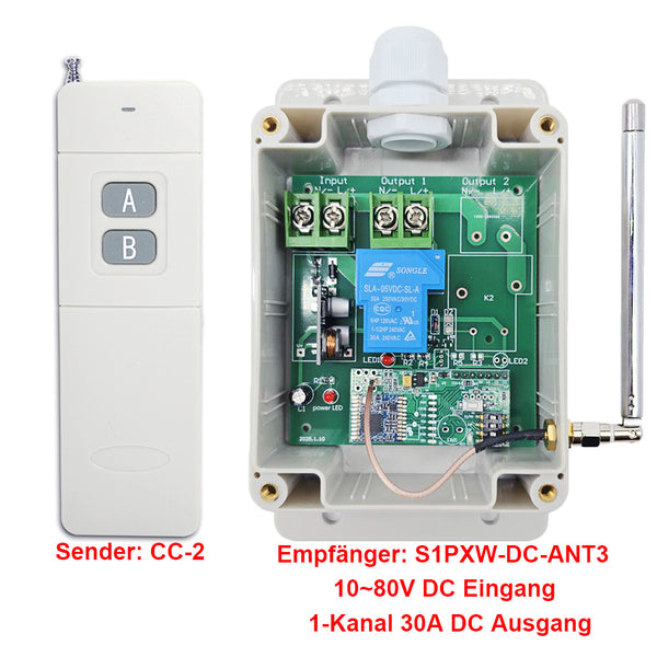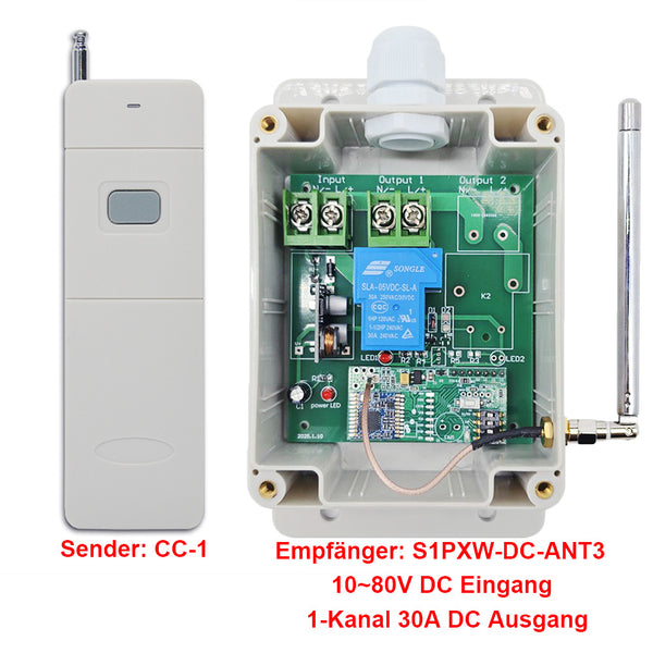 Dieser Empfänger S1PXW-DC-ANT3 und der Sender CC-1 / CC-2 bilden ein Empfänger Sender System. Dieses System kann in allen Arten von Industrie automation, Landwirtschaft, Haus, Fabrik, Haus, Bauernhof, Fahrzeug, Schiff, Offshore-Betrieb, Luftfahrzeug usw. Es kann verschiedene DC Geräte an Land, zu Wasser und in der Luft fernsteuern, wie Lichter, Sirenen, Schlösser, Motoren, Ventilatoren, Türen, Fenster, Elektromagnetventile, Sicherheitsalarm und Geschäftsschilder.