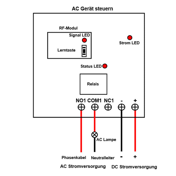 Relaisausgang: Dieser Empfänger ist der trockene Relaisausgang, es können zur Steuerung DC und AC Geräte verwendet werden. Die Ausgangsklemmen sind NO / NC (normalerweise geöffnet / normalerweise geschlossen) und dienen als Schalter. Es bedeutet, dass Sie auch eine separate Stromversorgung an Geräte anschließen sollen.