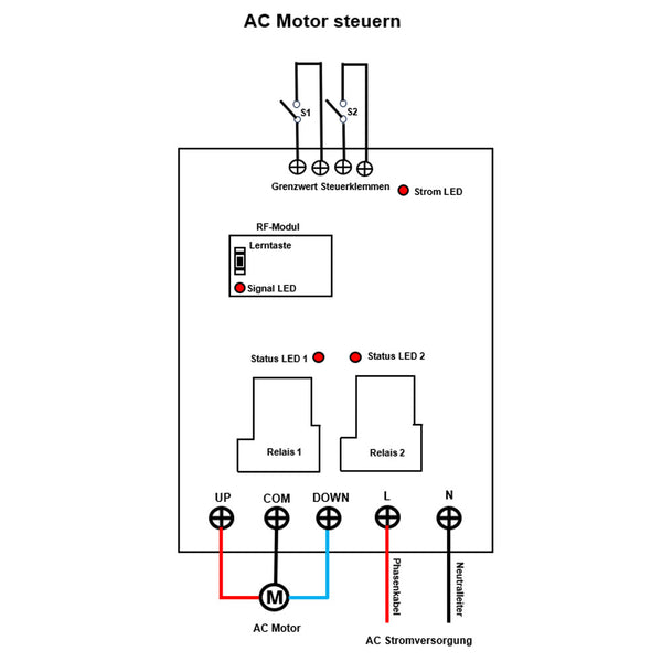 Dieser Empfänger ist eine drahtlose Steuerung für einen AC motor. Er und die Fernbedienung bilden ein drahtloses Senderempfängersystem. Wenn Sie einen AC motor an diesen Empfänger anschließen, können Sie den Motor mit der Fernbedienung in positiver oder umgekehrter Richtung drehen. Sie können zwei Endschalter an den Empfänger anschließen und damit den Motor stoppen. Es kann in Rollladen, Rolljalousien/ Türen, Leinwände, Markisen, Pumpen, Winden, Förderanlagen oder anderen Geräten und Mechanik mit AC motoren verwendet werden.