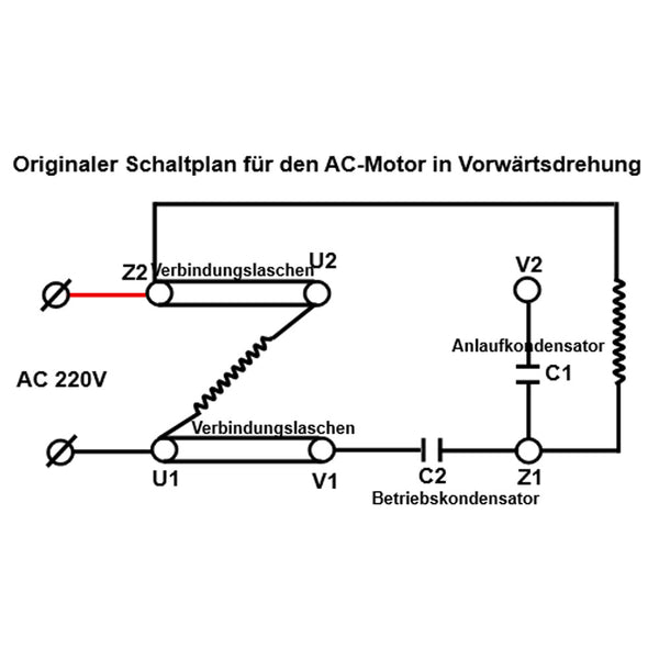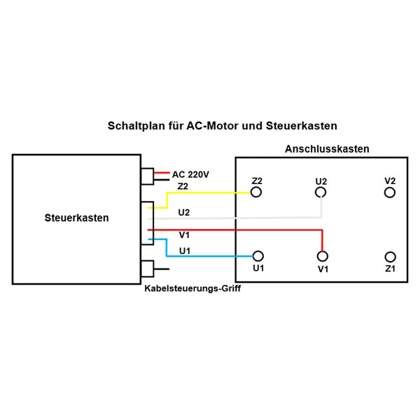 3) Verbinden Sie die Ausgangsleitungen Z2, U2, U1 und V1 des Steuerkastens mit den entsprechenden Klemmen Z2, U2, U1 und V1 im Anschlusskasten des AC-Motors.