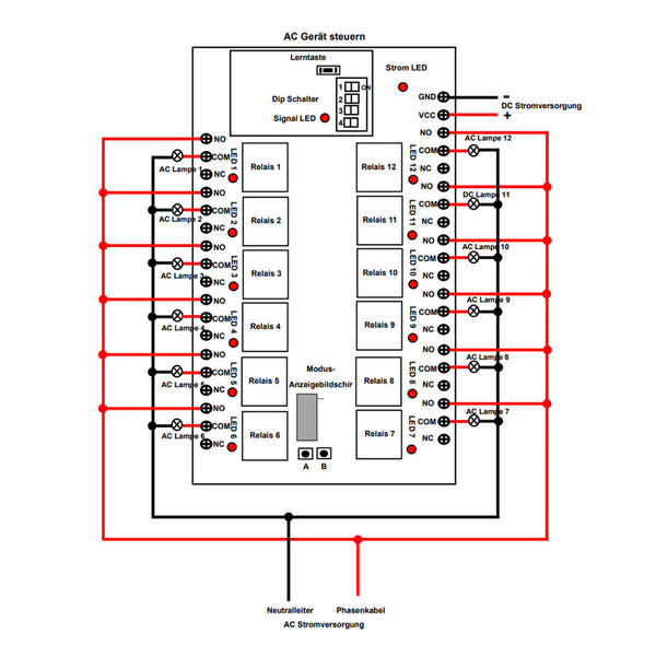 Drücken Sie die Taste 12 am Sender: Das Relais 12 im Empfänger wird aktiviert; Die anderen 11 Relais wird deaktiviert.