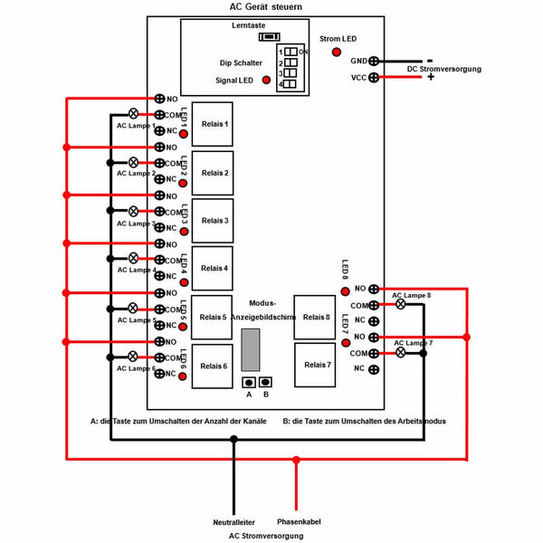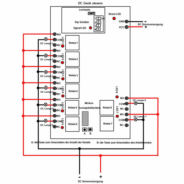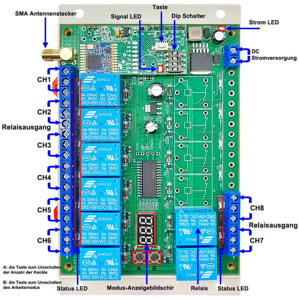 Der Empfänger verfügt über zwei Tasten: Taste A ist die Taste zum Umschalten der Anzahl der Kanäle und Taste B ist die Taste zum Umschalten des Arbeitsmodus.