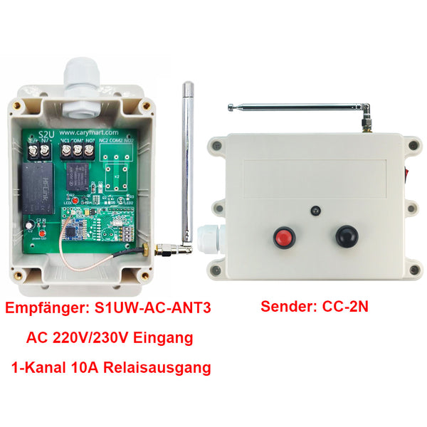 Der Empfänger S1UW-AC-ANT3 ist ein Fernschalter mit sehr großer Reichweite. Es wurde von der drahtlosen LORA-Kommunikationstechnologie (Long Range) entwickelt und verfügt daher über einen ultralangen Arbeitsabstand, eine ultrahohe Empfangsempfindlichkeit, eine hervorragende Entstörungsfähigkeit und einen geringeren Stromverbrauch. Es verwendet einen Transceiver-Chip, um die bidirektionale Kommunikation zu bilden und mit einen Sender CC-2N zur Bildung eines drahtlosen Steuerungssystem. Sein idealer Arbeitsabstand beträgt bis zu 5 Kilometer, was ein hervorragendes Gerät für die Fernsteuerung und Fernkommunikation ist.