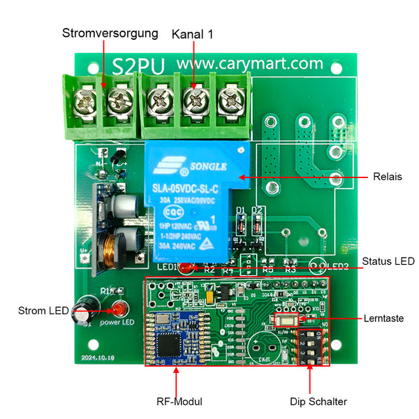 Relaisausgang: Dieser Empfänger ist der trockene Relaisausgang, es können zur Steuerung DC und AC Geräte verwendet werden. Die Ausgangsklemmen sind NO / NC (normalerweise geöffnet / normalerweise geschlossen) und dienen als Schalter.