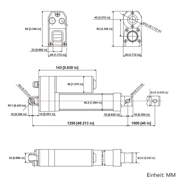 Einzugslänge: Wenn der Linearantrieb vollständig eingefahren ist, beträgt der Mittenabstand zwischen den beiden Montagelöchern 1250 mm.