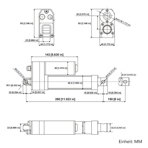 Einzugslänge: Wenn der Linearantrieb vollständig eingefahren ist, beträgt der Mittenabstand zwischen den beiden Montagelöchern 280 mm.