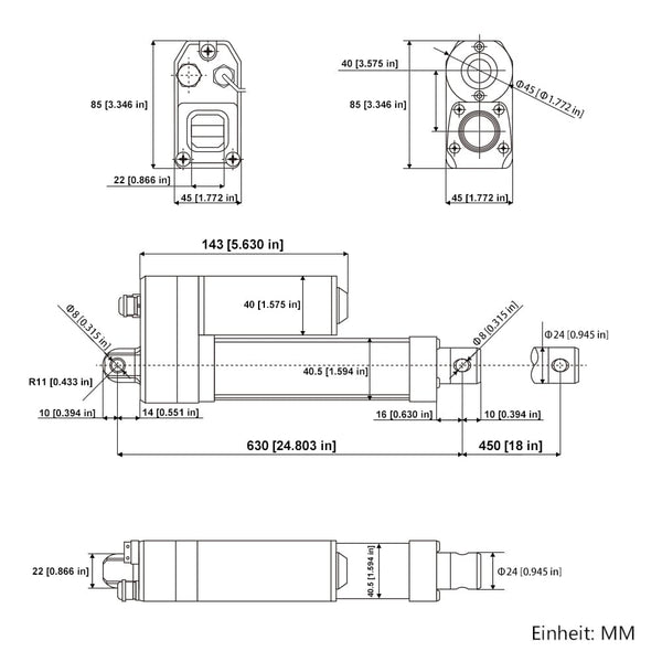 Einzugslänge: Wenn der Linearantrieb vollständig eingefahren ist, beträgt der Mittenabstand zwischen den beiden Montagelöchern 630 mm.