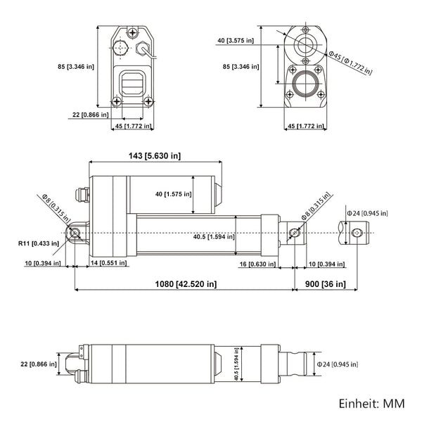Einzugslänge: Wenn der Linearantrieb vollständig eingefahren ist, beträgt der Mittenabstand zwischen den beiden Montagelöchern 1080 mm.